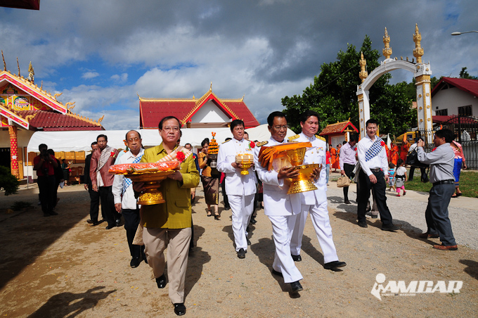 คณะโตโยต้าคาราวานทอดกฐินพระราชทานต่างลงจากรถ เดินเข้าวัดกันพร้อมหน้าตา และได้เวลาที่ขบวนกฐินเข้าสู่วัด โดยประธานในพิธี คือ เอกอัครราชทูตไทย ประจำสปป.ลาว คุณพิษณุ จันทร์วิทัน และ นายกสมาคมไทย-ลาวเพื่อมิตรภาพ ดร.วีระพงษ์ รามางกูร และ คุณจักริน ชลนทีทร รองผู้อำนวยการฝ่ายปฏิบัติการ สปป.ลาว บริษัท โตโยต้า มอเตอร์ ประเทศไทย จำกัด นำขบวนแห่กฐินวนรอบโบสถ์ 3 รอบ ก่อนจะนำถวายวัด ในงานบุญทอดกฐินครั้งนี้ต้องบอกว่าเป็นที่สนใจของสื่อมวลชน สปป ลาว มาก เพราะผมได้มีโอกาสเจอ พิธีกรรายการดังช่อง ลาวสตาร์ ” น้องน้ำฝน ” เลยได้แลกเปลี่ยนทัศนะคติในด้านการเป็นสื่อมวลชนกันเล็กน้อย ก่อนทั้งคณะจะรับประทาน “เฝอ” ร่วมกันด้วยความประทับใจ
