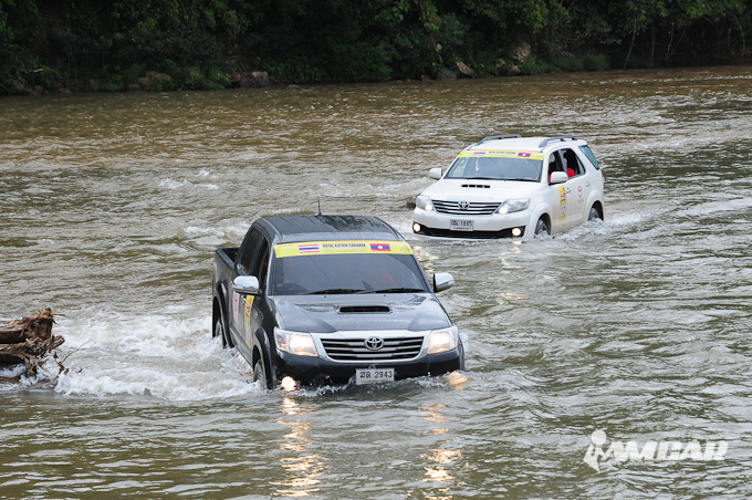 แต่รถในคาราวานของลาว ที่มีผู้ดูแลทริปสาวสวย “คุณปาล์ม” จาก บริษัท โตโยต้า มอเตอร์ ประเทศไทย จำกัด เกิดจมน้ำไป 1 คัน จากการที่ได้สัมภาษณ์ผู้ประสบเหตุ “คุณปาล์ม” บอกกับผู้สื่อข่าวอย่างพวกเราว่า “พอดีทางผู้ขับขี่ไม่ชินกับการขับลุยน้ำลึกขนาดนี้ ทำให้ดูไลน์ในการลุยน้ำไม่เป็น พร้อมกันนั้นในขณะที่ตัวรถจมน้ำผู้ขับขี่ตกใจ เข้าเกียร์ถอยหลังเหยียบคันเร่งเพิ่มทำให้น้ำเข้ากรองอากาศเครื่องน็อคเป็นที่เรียบร้อย แต่สถานการณ์ภายในรถไม่จบเท่านั้น น้ำยังคงทลักเข้าไปภายในห้องโดยสารมากขึ้นเรื่อยๆ จน “คุณปาล์ม” ต้องหนีขึ้นมายืนบนเบาะนั่งแล้วเธอก็ยังไม่รอดที่จะต้องเปียกอยู่ดี แต่ไม่นานทีม Service “วินซ์ลากรถ” ก็ลากรถคันที่จมขึ้นมาอย่างปลอดภัยครับ ทำให้เราต้องเสียเวลาให้ทีม Service ซ่อมแซมรถคันที่จมเพื่อให้ขับต่อได้ แต่คณะสื่อไทยได้แสดงถึง “น้ำใจ มิตรภาพที่ดีต่อกัน” ในการรอไปด้วยกัน พร้อมทั้งแสดงถึง “ศักยภาพอันสุดยอด” ของทีม SERVICE PR TOYOTA ที่สามารถซ่อมจนรถสามารถขับต่อไปได้