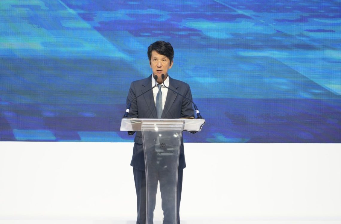 “ดังนั้นสิ่งแรกก็คือการนำเสนอผลิตภัณฑ์ที่คำนึงถึงสังคมแห่งความเป็นกลางทางคาร์บอน โดยโตโยต้าได้แนะนำ CAMRY HEV สู่ตลาดในปี พ.ศ.2552 โดยเป็นรถรุ่นแรกที่นำระบบไฟฟ้ามาใช้ ทำให้ยอดขายสะสมของรถ HEV บรรลุ 173,000 คันในปัจจุบัน ยิ่งกว่านั้นเราได้นำเสนอความสบายใจในทุกด้านสำหรับการใช้งานให้กับลูกค้า ทั้งตัวผลิตภัณฑ์ การบริการหลังการขาย และแพคเกจทางด้านสินเชื่อ นำโดย All-New YARIS CROSS ซึ่งได้รับการตอบรับเป็นอย่างสูงจากลูกค้า และขอขอบคุณการสนับสนุนอย่างดียิ่งจากท่านสื่อมวลชน นอกจากนั้นยังมีรถยนต์ในกลุ่ม HEV ที่หลากหลายตั้งแต่ SUV ไปจนถึงรถยนต์ซีดาน ได้แก่ INNOVA ZENIX, COROLLA CROSS, CAMRY และ COROLLA ALTIS โดยปัจจุบันโตโยต้ามีรถยนต์ในกลุ่ม HEV จำหน่ายทั้งสิ้นถึง 7 รุ่น และยังมีแผนเปิดตัวรถยนต์ไฟฟ้ารุ่นใหม่ๆ เพื่อตอบสนองความต้องการที่หลากหลายของลูกค้า ที่สำคัญกว่านั้นต้องเป็นรถยนต์ที่ส่งเสริมการลดคาร์บอนไดออกไซด์ด้วยเช่นกัน ส่วนแกนหลักที่ 2 ก็คือ ผลิตภัณฑ์ของเราต้องส่งเสริมความสุขของผู้ใช้ โดยนอกจาก HEV เรายังนำเสนอรถยนต์อีโคคาร์ยอดนิยม อย่างเช่น YARIS ATIV, YARIS Hatchback และ MPV 7 ที่นั่ง VELOZ โดยอีกหนึ่งไฮไลท์บนเวทีแห่งนี้ก็คือ All New HILUX CHAMP ที่เพิ่งเปิดตัวไปเมื่อ 2 วันที่ผ่านมา”