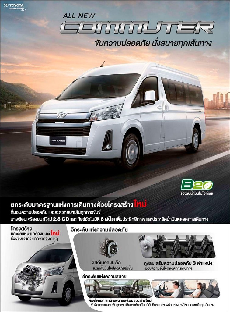 บริษัท โตโยต้า มอเตอร์ ประเทศไทย จำกัด แนะนำรถตู้ คอมมิวเตอร์ใหม่ล่าสุด ที่ได้รับการพัฒนาและออกแบบผลิตภัณฑ์เพื่อตอบโจทย์ความต้องการของลูกค้า ทั้งผู้ขับขี่ ผู้โดยสาร พร้อมทั้งตอบสนองนโยบายภาครัฐที่ให้ความสำคัญกับความปลอดภัยบนท้องถนน โดยรถตู้ “คอมมิวเตอร์” ใหม่นี้ เน้นถึงความปลอดภัยสูงสุดด้วยระบบมาตรฐานความปลอดภัยที่ครบครัน พร้อมกับความสะดวกสบายที่มากยิ่งขึ้น ด้วยการเปลี่ยนตำแหน่งเครื่องยนต์มาไว้ด้านหน้า (Semi-Bonnet) ช่วยเพิ่มความเงียบในห้องโดยสาร ควบคู่ไปกับระบบช่วงล่างใหม่ที่ให้ความนุ่มนวลมากยิ่งขึ้น สามารถรองรับการใช้งานบนทุกสภาพถนน นอกจากนี้ดีไซน์ภายนอกยังโฉบเฉี่ยวสะดุดตา ภายในกว้างขวางสะดวกสบาย อีกทั้งสมรรถนะการขับขี่ที่ยอดเยี่ยม ประหยัดน้ำมัน ด้วยเครื่องยนต์ GD 2.8 ลิตร ใหม่ มีให้เลือกทั้งเกียร์ธรรมดา 6 สปีด และเกียร์อัตโนมัติ 6 สปีด ตอกย้ำความเป็นที่สุดของการเดินทางอย่างแท้จริง