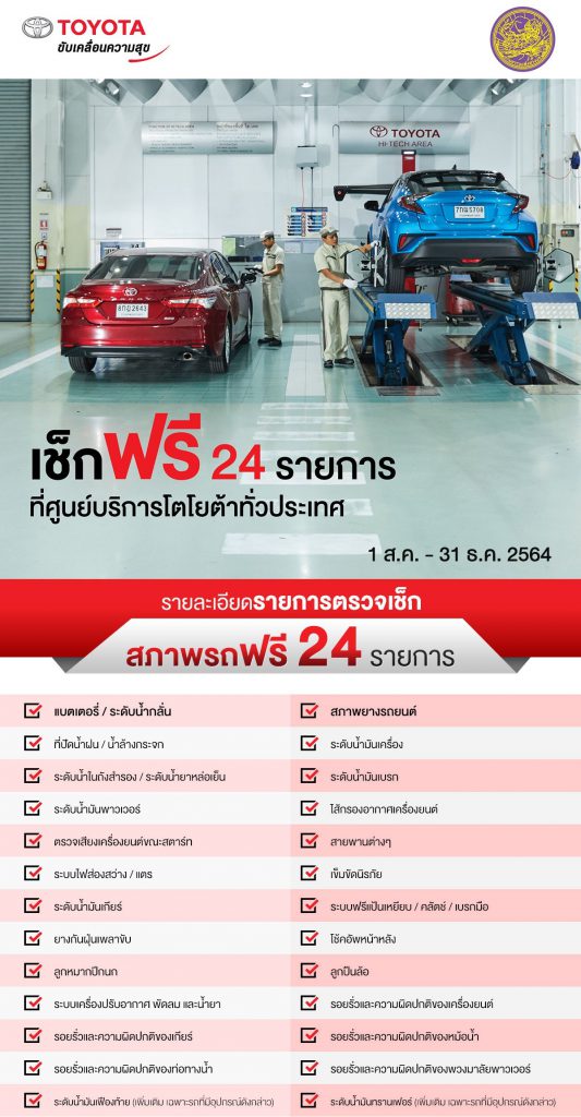 ทั้งนี้ เพื่อเป็นการสร้างความมั่นใจให้การเดินทางท่องเที่ยวเป็นไปอย่างปลอดภัยตลอดเส้นทาง บริษัทฯ พร้อมด้วยผู้แทนจำหน่ายโตโยต้าทั่วประเทศ จึงได้มีการให้บริการฉีดพ่นน้ำยาฆ่าเชื้อในห้องโดยสารและตรวจเช็กสภาพรถยนต์ฟรี 24 รายการ ในช่วงเทศกาลท่องเที่ยวปีใหม่ เพื่อเป็นการเตรียมความพร้อมรถยนต์ให้อยู่ในสภาพสมบูรณ์ และป้องกันการเกิดอุบัติเหตุ ซึ่งผู้ที่สนใจสามารถนำรถยนต์ไปตรวจเช็กได้ตั้งแต่วันที่ 1 สิงหาคม 2564 – 31 ธันวาคม 2564 โดยมีรายการตรวจเช็ก 24 รายการ ดังนี้